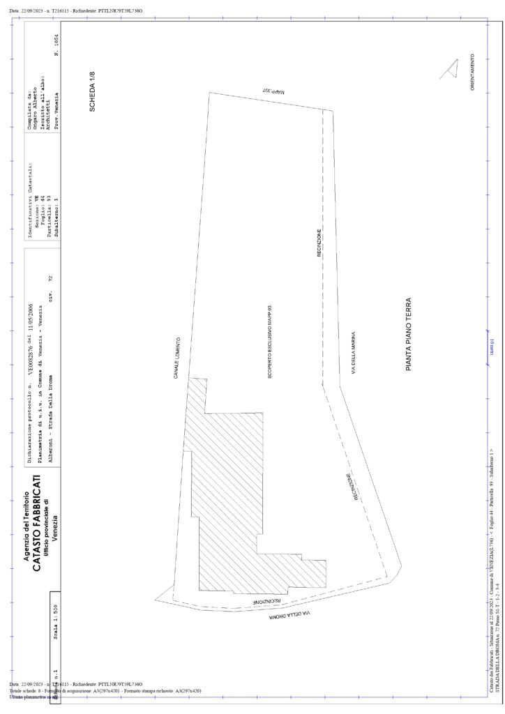 The property covers an area of 7,400 sqm and hosts a building divided into several levels, for a covered area of 1,384 sqm and a total gross surface area of 3,683 sqm. The property boasts a direct water landing from the Lemento canal equipped with moorings for boats with direct access to the sea towards the mainland. The current configuration of the building is the result of various building interventions that have taken place over the years, from the first structure, which dates back to the early 1950s, up to the last intervention carried out in 2006. Overall, the property is in a poor state of conservation and has different types of finishes, which reflect the different periods of execution of the works.
