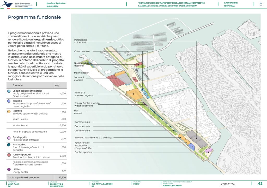 L’area sarà rivitalizzata per includere ulteriori attracchi per crociere fluviali, yacht e navi di lusso, inserendo un nuovo terminal passeggeri e un parcheggio multipiano, oltre a mantenere le operazioni portuali essenziali e introdurre spazi per la cantieristica (anche minore). Il progetto enfatizza gli spazi pubblici di alta qualità che integrano il lungomare con il centro storico di Chioggia e prevede la realizzazione di nuovi padiglioni a servizio della cantieristica di diporto, un hotel, spazi commerciali (incluso un fish market), oltre ad aree destinate al trattamento del pesce. Tali funzioni si propongono di valorizzare gli spazi in vari momenti della giornata coniugandosi con lo sviluppo di aree verdi ricreative come i “Giardini dei Saloni” e la costruzione del “Chilometro Verde”, una passerella sopraelevata che collega i principali edifici e spazi pubblici. Queste aree saranno multifunzionali e fungeranno da sedi per eventi, mercati e attività ricreative.