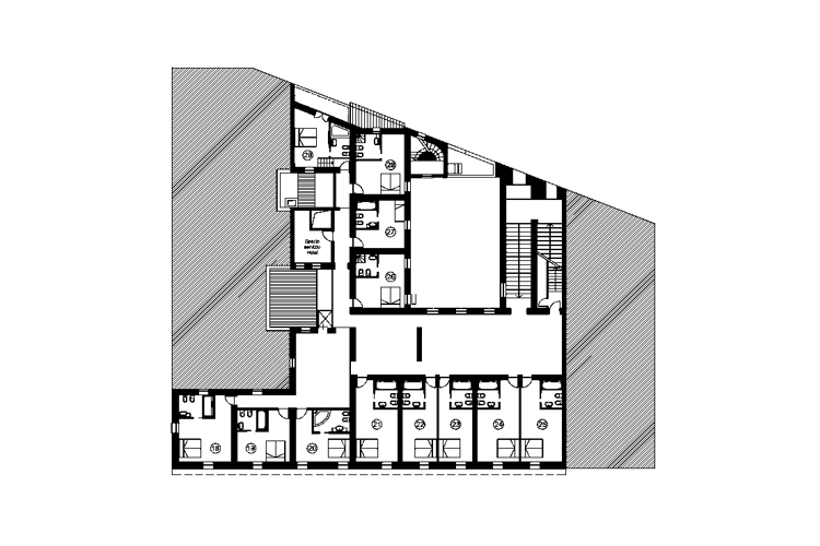 Si prevede di concentrare le suites prevalentemente ai piani ammezzato, primo e secondo, destinando invece il piano sottotetto a spazi di supporto alla struttura alberghiera.
