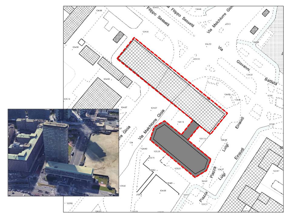 L’immobile, realizzato negli anni ’60 dal Comune di Milano, è costituito da due corpi di fabbrica, una torre di 28 piani fuori terra ed un corpo basso che si sviluppa su via Melchiorre Gioia, articolato su 7 piani fuori terra, con un ponte di collegamento tra i due edifici realizzato con struttura in acciaio che si sviluppa per tutti i piani fuori terra del corpo più basso. Gli spazi interrati, articolati su tre livelli per 24.000 m² e destinati ad autorimessa per 727 posti auto, sono comuni ad entrambi i corpi di fabbrica, e sono localizzati al di sotto della Piazza Luigi Einaudi. L’edificio più alto sviluppa una superficie di 750 m² per piano mentre quello più basso sviluppa una superficie di 1.760 m² circa per piano. La copertura è a falde inclinate al di sotto delle quali è stato ricavato un sottotetto non abitato. A livello urbanistico il complesso è individuato, sulla base del vigente PGT, nell’ambito del tessuto urbano di recente formazione di cui all’art. 2.1.a.ii delle norme di attuazione del Piano delle Regole.