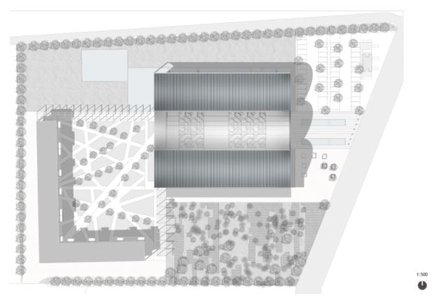 uno spazio a doppia altezza costituito da colonne in cemento, travi e solai. Aggiungendo localmente un nuovo piano intermedio, viene creata una hall interna aperta, circondata da atelier/dipartimenti; luoghi di lavoro e aule. Nelle navate laterali, a piano terra ci sono spazi per il dipartimento di diagnostica, day-hospital e