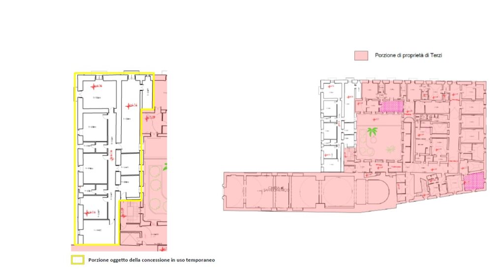 L’unità immobiliare, proposta in concessione temporanea, ha pianta regolare e si articola su 8 vani principali oltre disimpegno e 2 servizi igienici dotati di antibagno. L’immobile è dotato di affacci e vedute sia sulla piazza pubblica che all’interno dell’ex chiostro monastico.